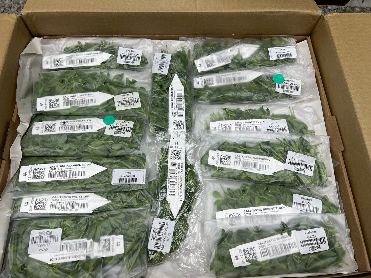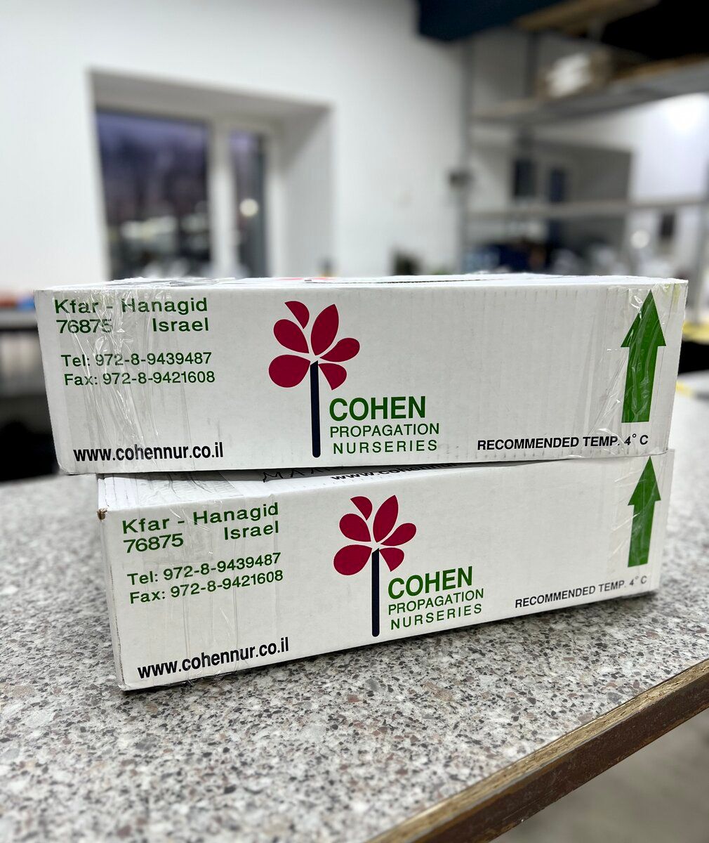Декабрь 2025: очередная партия премиум-черенков от Cohen Propagation Nurseries прибыла напрямую из Израиля. Фирменные коробки с розовым логотипом-цветком, рекомендованная температура хранения +4°C, каждый пакет промаркирован штрих-кодом и QR-кодом для полной прослеживаемости. Это не просто черенки — это 222 миллиона ежегодного опыта в каждой коробке.