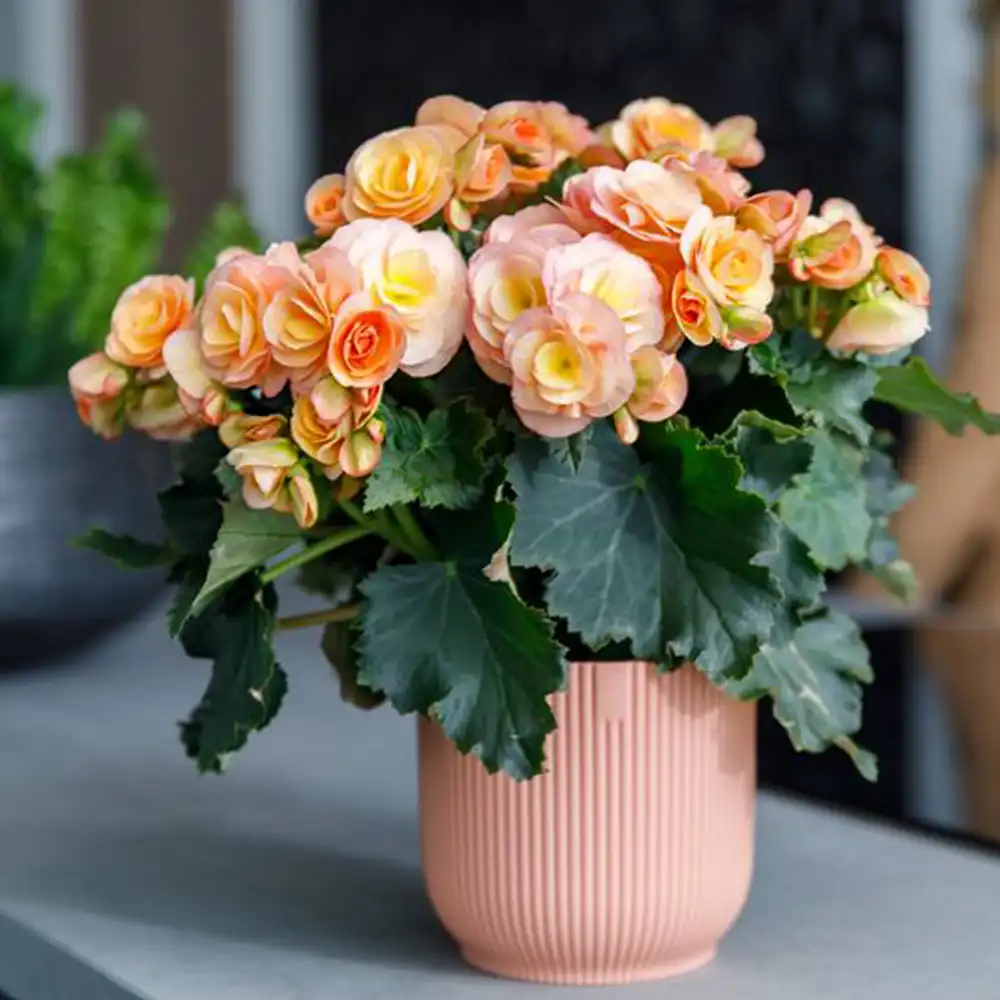 Бегония Элатиор Hailey Sunset – один из самых эффектных сортов группы Элатиор, выведенных специально для круглогодичного выращивания в комнатных условиях. Сорт привлекает внимание крупными махровыми цветками в теплой закатной палитре: от нежного персикового и абрикосового до насыщенного оранжевого с легким розовым подтоном. Цветки собраны в пышные соцветия, создающие яркое цветовое пятно на фоне глянцевой темно-зеленой листвы. Завод ФЛОРА выращивает этот сорт из вегетативных черенков в современных климатических камерах с контролируемыми условиями, что гарантирует сохранение всех сортовых характеристик и высокое качество посадочного материала.