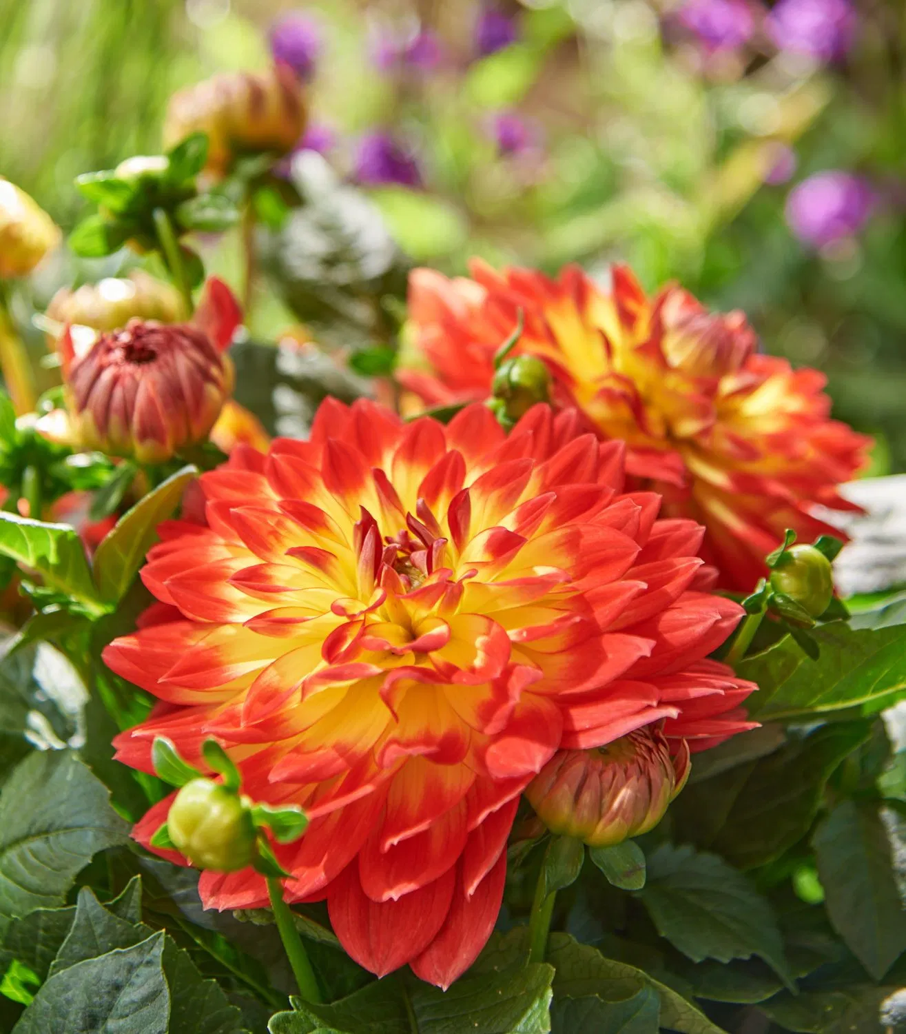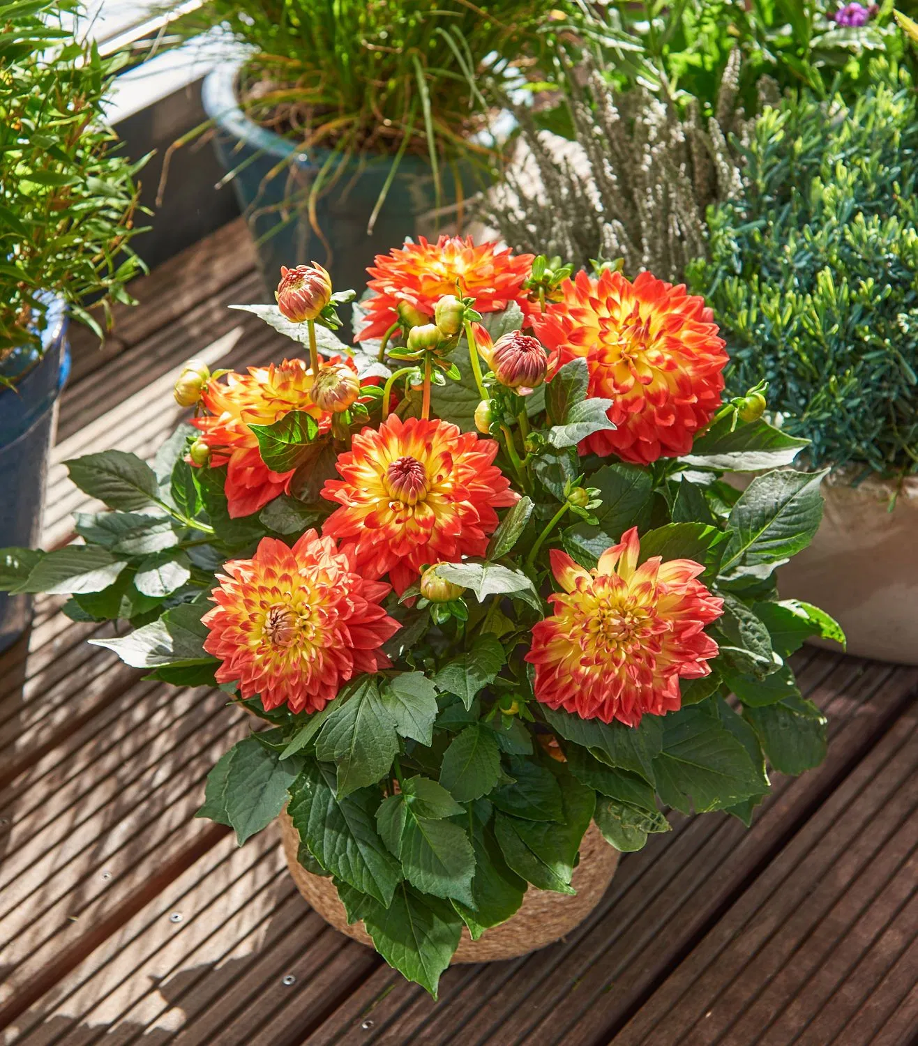 Георгин Labella Maggiore Fun Flame — универсальный сорт для создания ярких акцентов в саду и на балконе. Компактная форма куста делает его идеальным выбором для контейнерного выращивания: эффектно смотрится в балконных ящиках, напольных кашпо и декоративных горшках на террасе. В открытом грунте сорт прекрасно подходит для переднего плана цветников, создания бордюров вдоль дорожек и оформления входных групп. Огненная окраска цветков гармонично сочетается с растениями холодных оттенков: голубыми агератумами, фиолетовыми петуниями, синими лобелиями. Контрастные композиции с белыми и жёлтыми цветами создают праздничное настроение. Георгины серии Labella отлично смотрятся в групповых посадках по 3-5 растений одного сорта или в миксах с другими сортами серии. Подходит для профессионального озеленения городских пространств, оформления летних кафе и частных садов.