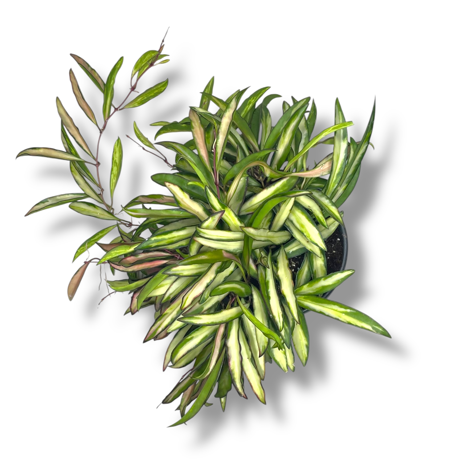 Hoya wayetii Tricolor – редкая вариегатная форма хойи Вайети, выделяющаяся среди коллекционных растений своей уникальной трехцветной окраской. В отличие от базового зеленого вида, эта форма демонстрирует эффектное сочетание изумрудно-зеленых, кремово-желтых и нежно-розовых оттенков на узких удлиненных листьях. Каждый лист представляет собой уникальное произведение природы с неповторимым рисунком. Завод ФЛОРА предлагает качественный посадочный материал – неукорененный черенок с двумя узлами, выращенный в профессиональных условиях с применением современных технологий климат-контроля. Это идеальный вариант для опытных цветоводов и коллекционеров, желающих пополнить свою коллекцию редким экземпляром.