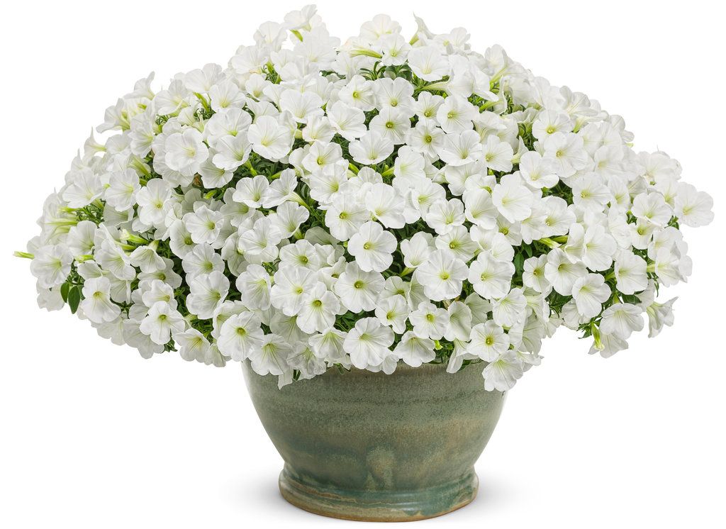 Петуния Mini Vista White — универсальный сорт для самых разных дизайнерских решений. Белоснежные цветки служат идеальным фоном и связующим элементом в любых цветочных композициях. В подвесных кашпо и балконных ящиках каскадные побеги формируют эффектную белую «шапку», которая великолепно смотрится на фоне стен и ограждений.