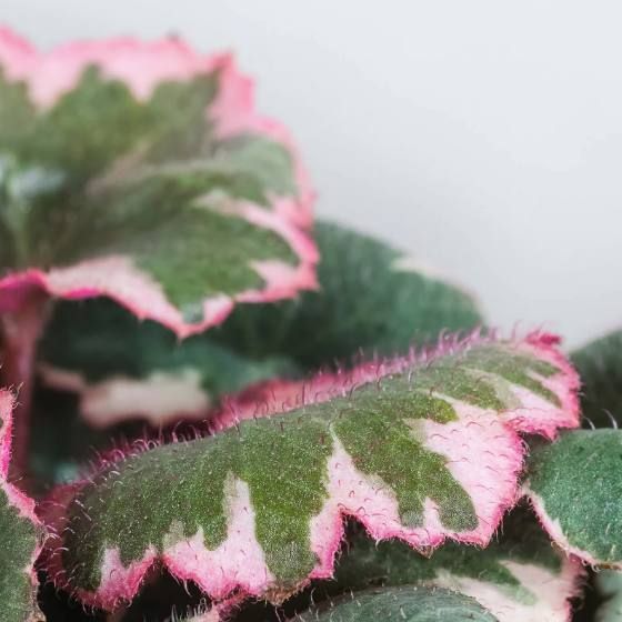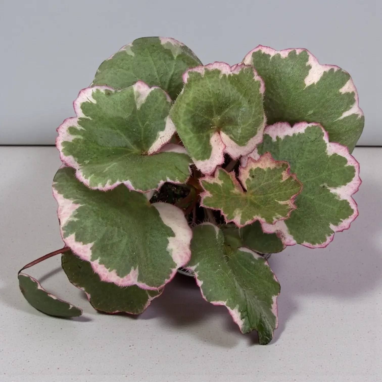 Саксифрага плетеносная вариегатная (Saxifraga stolonifera) — декоративнолистная форма камнеломки плетеносной, одного из самых популярных видов семейства Камнеломковые (Saxifragaceae). Родина вида — влажные скалистые склоны и тенистые леса Восточной Азии, где камнеломка растёт в расщелинах камней, покрывая их живым ковром. Вариегатная форма отличается от видовой нерегулярной кремово-белой окантовкой листьев, которая придаёт растению нарядный, праздничный вид. Каждый лист уникален: рисунок вариегатности не повторяется, создавая живую мозаику оттенков зелёного, серебристого и кремового. Верхняя сторона листа покрыта тонкими волосками и расчерчена серебристыми жилками, а нижняя окрашена в насыщенный пурпурно-красный цвет. Это контрастное сочетание особенно эффектно смотрится в подвесных кашпо, когда листья слегка приподнимаются и открывают свою «изнанку». Камнеломка плетеносная вариегатная — настоящая жемчужина коллекции, которая сочетает неприхотливость с высокой декоративностью и подходит для выращивания в комнатных условиях, на балконах и в открытом грунте в качестве сезонного почвопокровника.